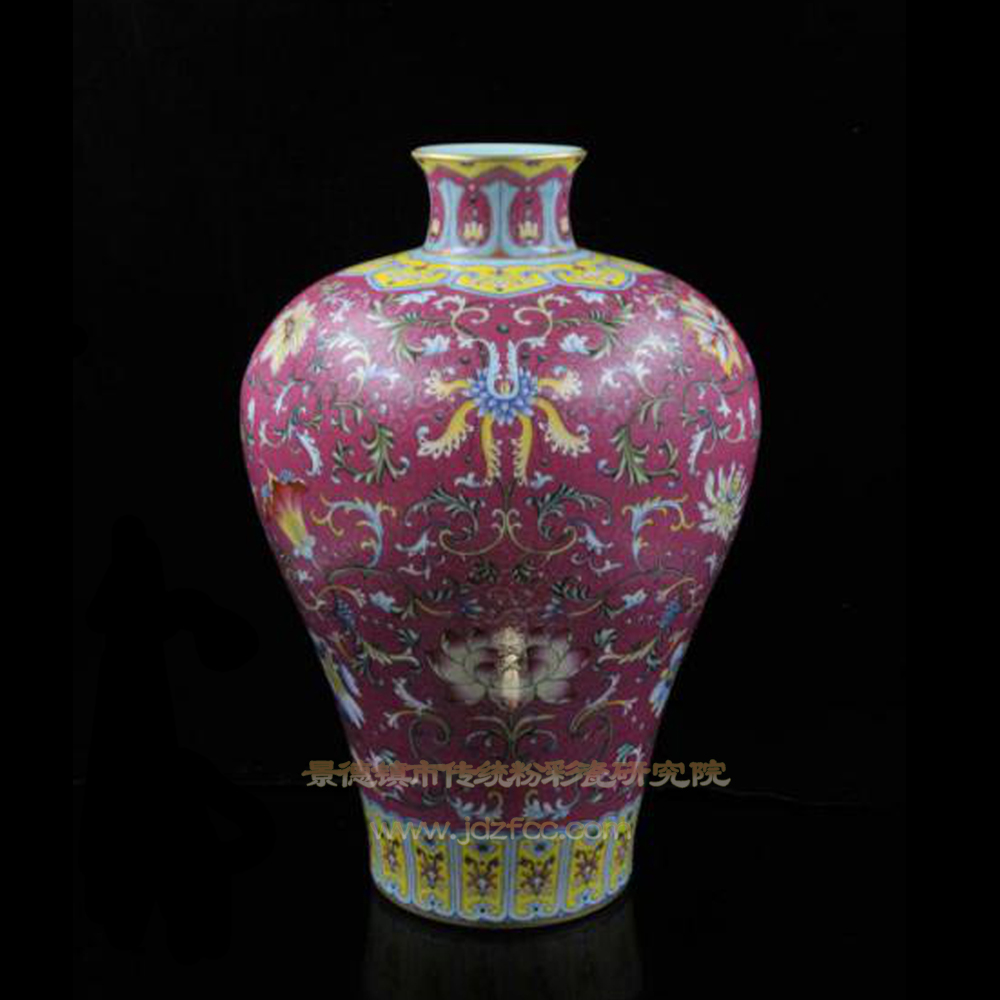 梅瓶,最初出现在北宋时代,因口径之小仅能插梅枝而得名。这件仿乾隆胭脂红地轧道粉彩勾莲纹梅瓶外形高雅秀美,色彩丰富艳丽,纹饰细腻流畅,技艺工整精细,所用的轧道工艺,就是需要在烧好瓶胎后,先在白胎上均匀施一层胭脂红地釉底色料,继而用一种状如绣针的金属在釉地上拨画出一种细如毫芒的凤尾纹,再以粉彩加绘出勾莲纹花草图案,被称为“锦上添花”。