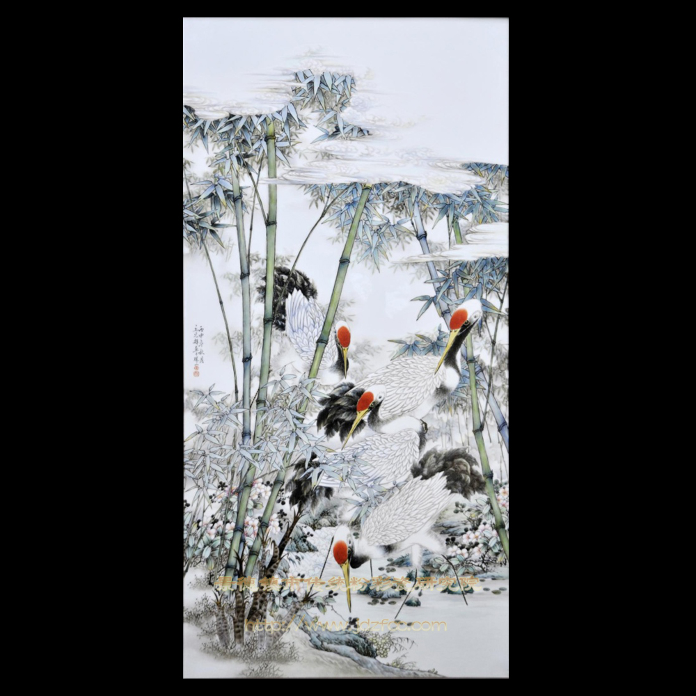 此作画面竹林中四只仙鹤相互依偎,或低头觅食,或回首顾盼,身姿优美,形象逼真,情景交融,栩栩如生。