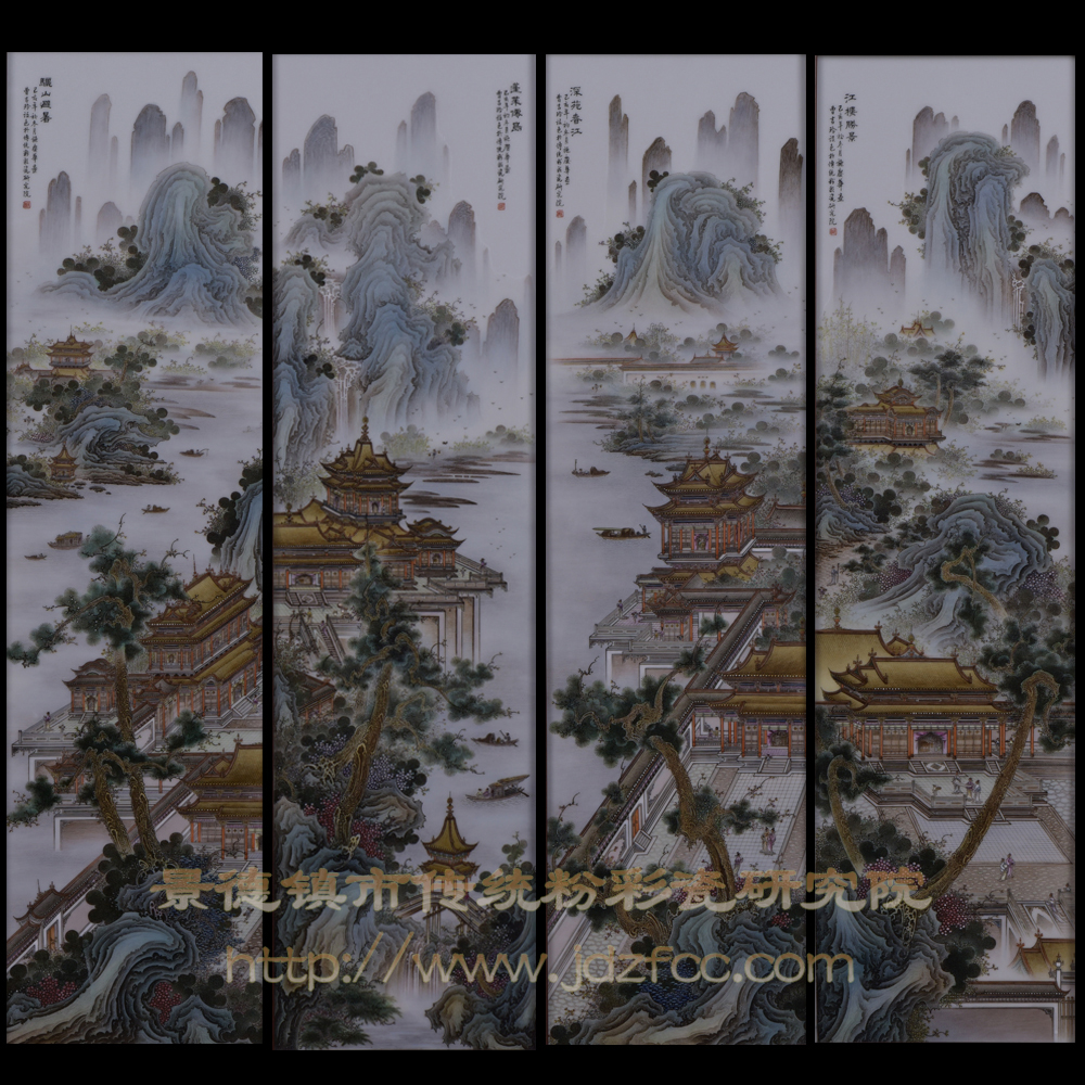 此四条屏展示了骊山避暑,蓬莱仙岛,深苑春江,江楼胜景四个气势非凡的画面,作品造型准确,讲究笔墨韵味和用笔气韵,加之所配人物,苍树,繁花,船只,飞瀑,以及青山绿水配景,达到了“极貌以写物”的境地。可谓雍容华贵,曲尽其体,浑然化一,堪称山水瓷画之佳作。