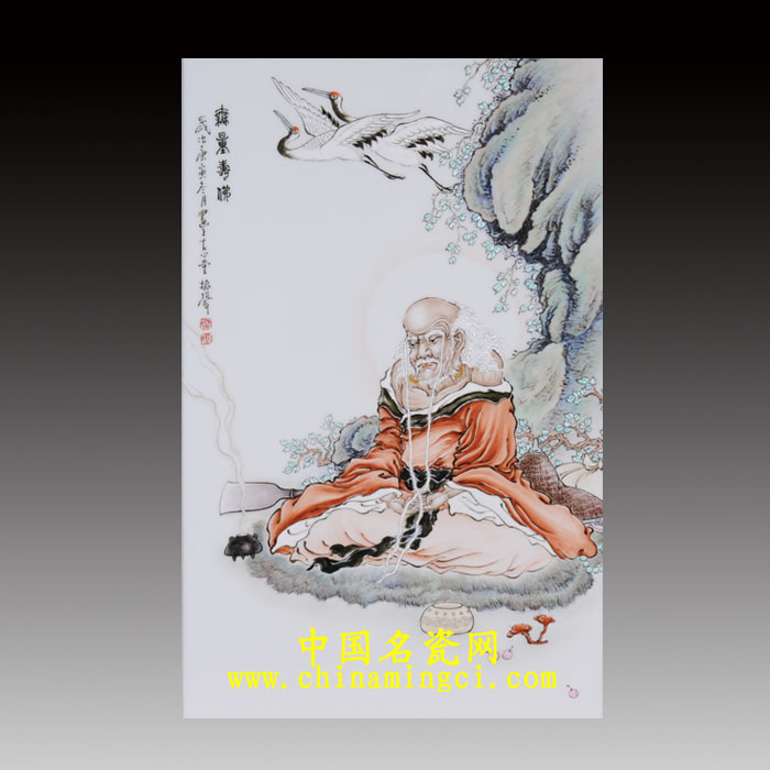 作品取传统佛教题材,绘无量寿佛盘坐悟法之图。寿佛席地而坐于山崖下的菩提叶上,身前一钵一炉,灵芝红果,香炉里烟雾冉冉,身后一禅杖,一斗笠,山石突兀,绿萝吐翠。空中两只仙鹤展翅高飞。人物的刻画上更为精妙,寿佛鹤发童颜,大耳垂肩,长眉着地,突出了寿命之无量。他慈眉善目,安静祥和,不为外界所扰,身披红色长袍,宽大的衣衫从身上滑落,袒胸露肩,表现出其不拘小节的宽大心胸。