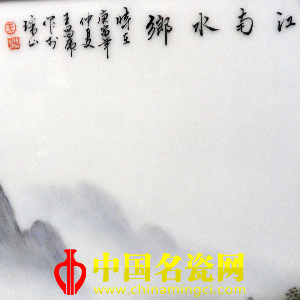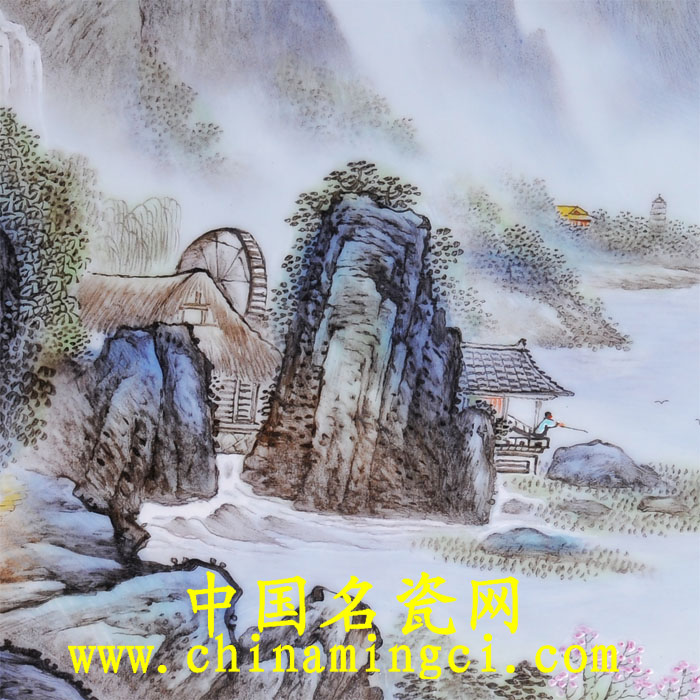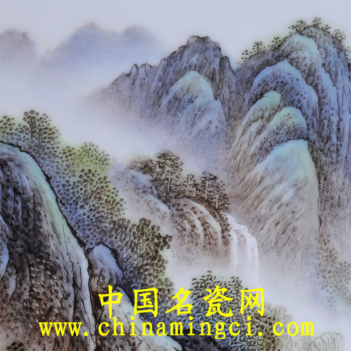 作品中,层峦吐翠、峰峰相连,或峭拔陡峻,或奇壑突兀。其近山凝重,远山虚淡,相互衬托,景致奇妙;峡谷中湍流淙淙,飞流而下,至山脚处渐次开阔,形成溪水,沿山隈而缓行;溪水涟漪清澈,滟潋旖旎,明如澄月,朗如琼瑶;溪水莲畔,树木蓊郁,山石起伏,有茅舍农屋隐露其间,渔翁临江垂钓。作品笔墨工整细秀,自如流畅,设色淡雅,层次丰富,充分显示其山水画缜密清润的艺术特色和个性风格。就陶瓷山水装饰形式而言,有汪野亭青绿山水之秀,又有汪大沧秃笔山水之野,画师融二者之长自成一格,是谓难得。(张青)