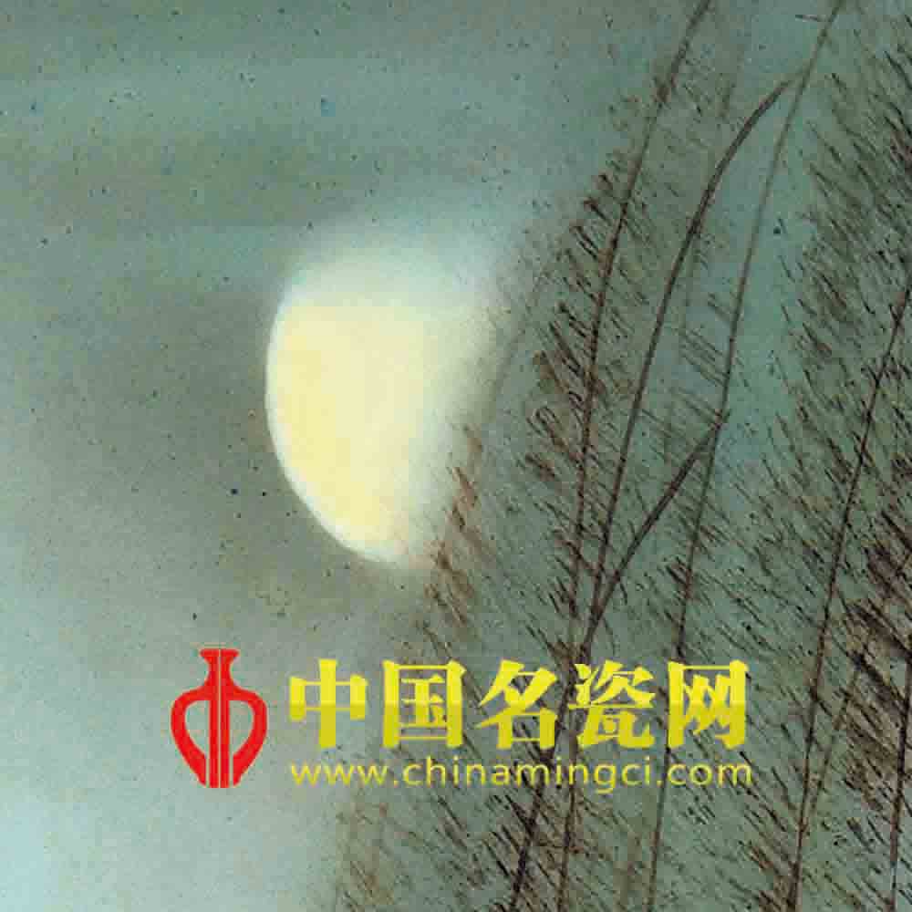 赵明生老师得其父——著名景德镇陶瓷美术家赵惠民的面授耳提,精擅粉彩仕女图。此图取材于王实甫《西厢记》中《酬简》一折,重在刻画“花有清香月有阴,歌管楼台细有声,秋千院宇夜深深”之际,红娘在为莺莺传书于张生之途中的情景。画中红娘姿容曼妙、体态柔美、轻步裙裾、欲言还休的形神与柳丝袅袅、月色朦胧所营造的环境氛围,恰到好处的揭示了人物复杂的内心情致和心理活动。大师笔下的红娘形象,脂粉浓艳,却自有逸韵,所谓“工写结合色清新,妩媚妙容动心扉,悉心研习赵氏笔,瓷苑又绘新佳丽。”(清秋)