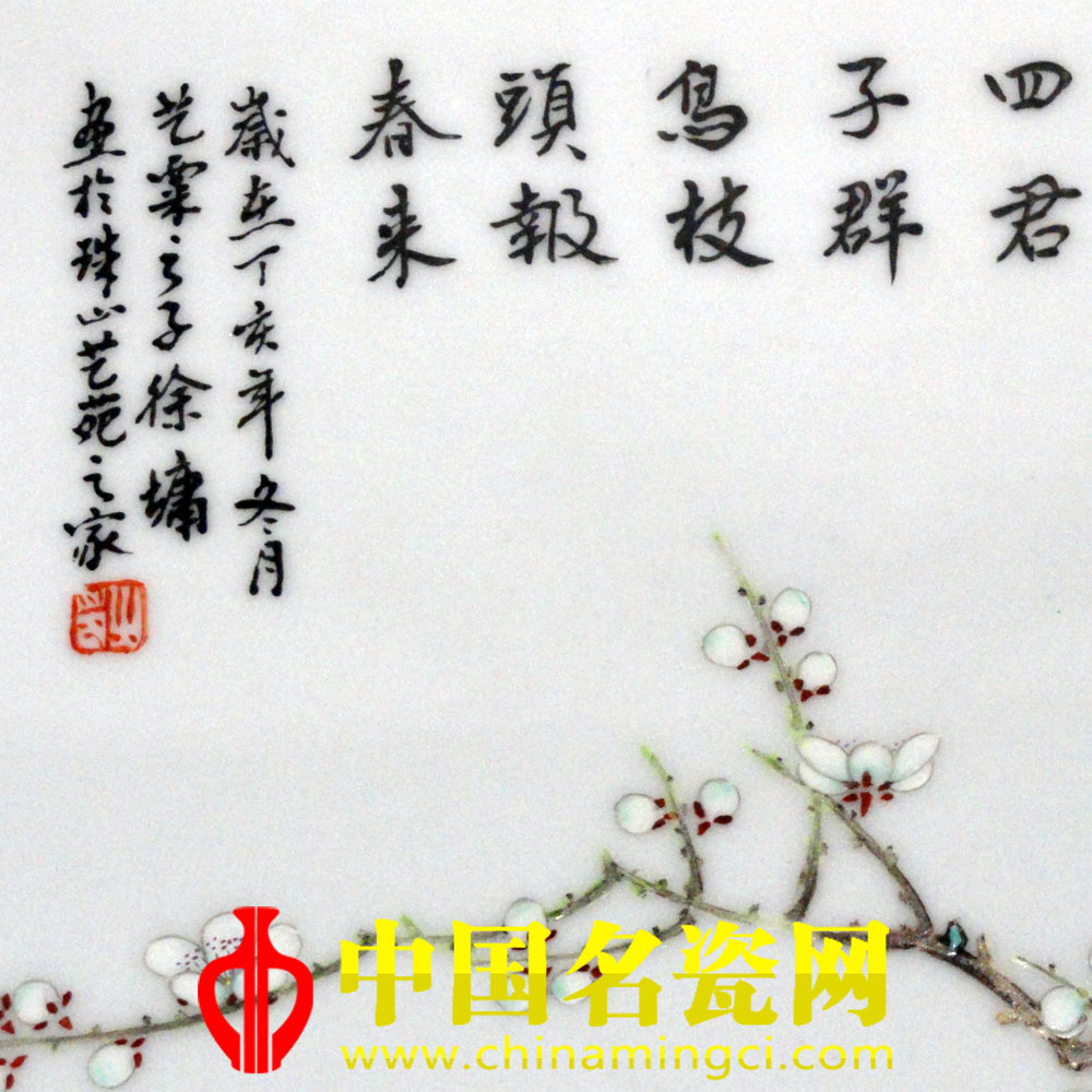 左上角落款:“岁在丁亥年冬月艺粟之子徐墉画於珠山艺苑之家”。题诗:“芳园又见四君子,群鸟枝头报春来”。铃红色:“作”“之印”章,右下角铃:“艺苑之家” 章(郝丽敏)