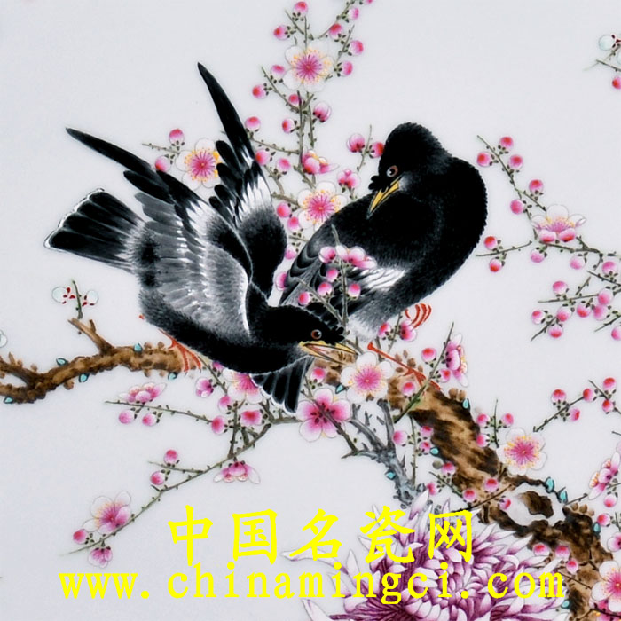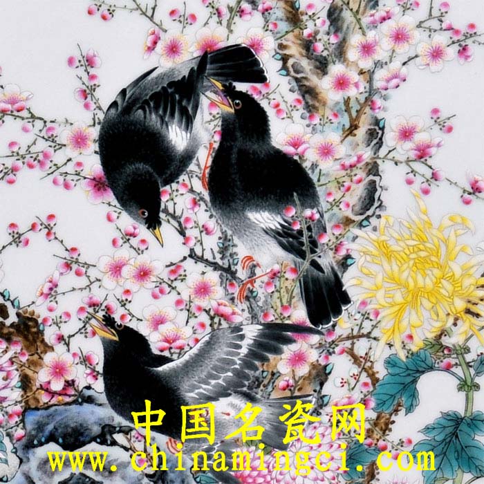同时也恰恰呼应了画的主旨:“芳园又见四君子,群鸟枝头报春来”。徐墉老师以精细的工笔描绘八哥,惟妙惟肖,呼之欲,并将梅之遒劲,兰之清新,竹之淡雅,菊之靓丽,表现得淋漓尽致。画面结构和谐,繁简有度,设色清丽,可见徐墉老师深厚的工笔绘画技艺及对粉彩的超强驾驭能力。