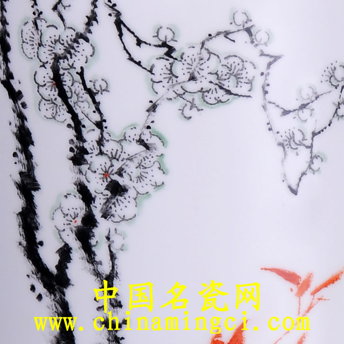 瓶的另一侧绘双清图。超凡脱俗、卓然独放的梅花,几枝劲节清高的秀竹。清冷的色调,简括的笔法,具有浓郁的中国文人画意味。