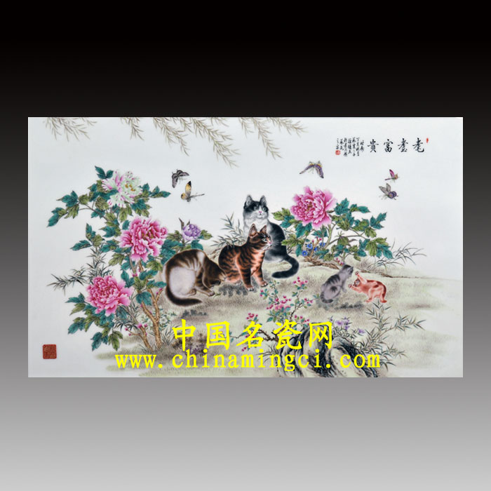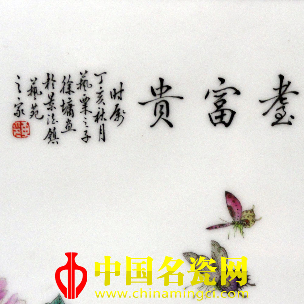 瓷板右上角落款:“时属丁亥秋月艺粟之子徐墉画於景德镇艺苑之家”。铃红色:“作”“之印”章,左下角铃:“艺苑之家”章(郝丽敏)