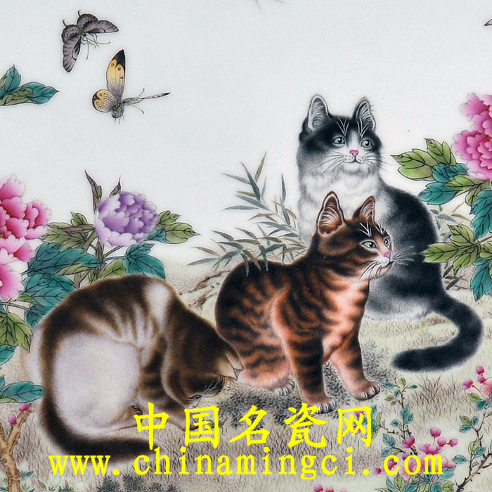 徐墉老师的作品为谐音、寓意并重的传统纹饰之一。《礼记·曲礼上》记载:“七十曰髦,八十曰耋”。耄耋即指年老寿高的长辈。绘画以“猫蝶”谐音“耄耋”。画中五猫扑蝶,其以笔为骨,粉彩为肉,产生出只见诸色,不见骨骼轮廓的工笔效果。尤其是猫咪的皮毛纹章,由于撕毛的精到,使之不仅毛感强,而且动势悠然。