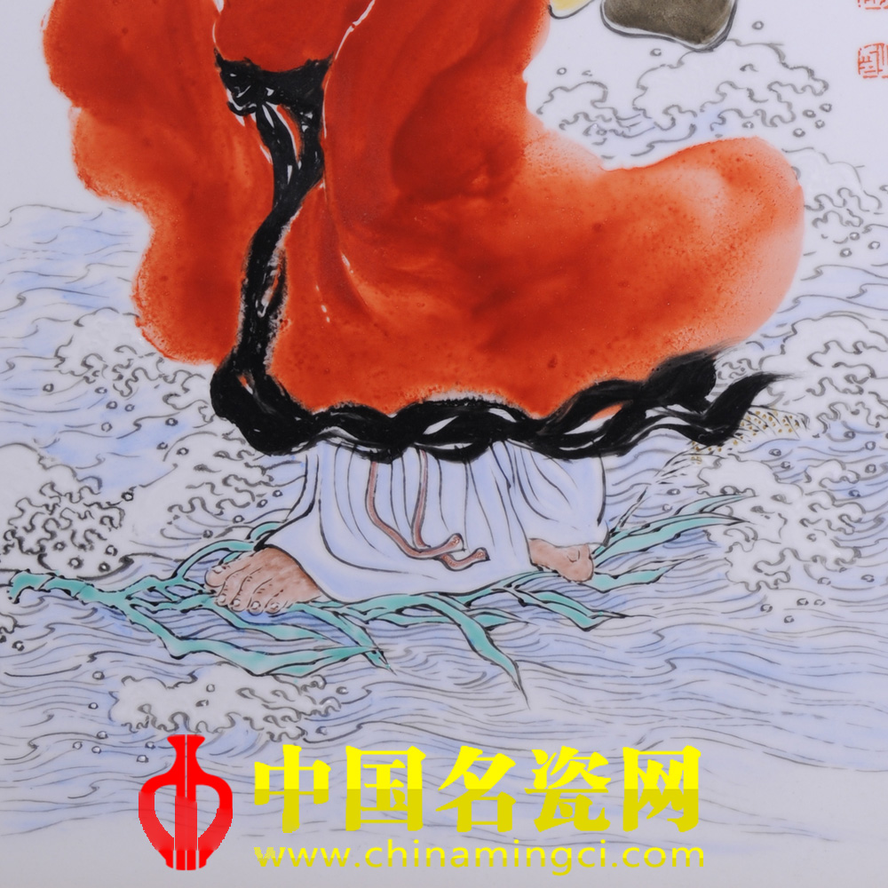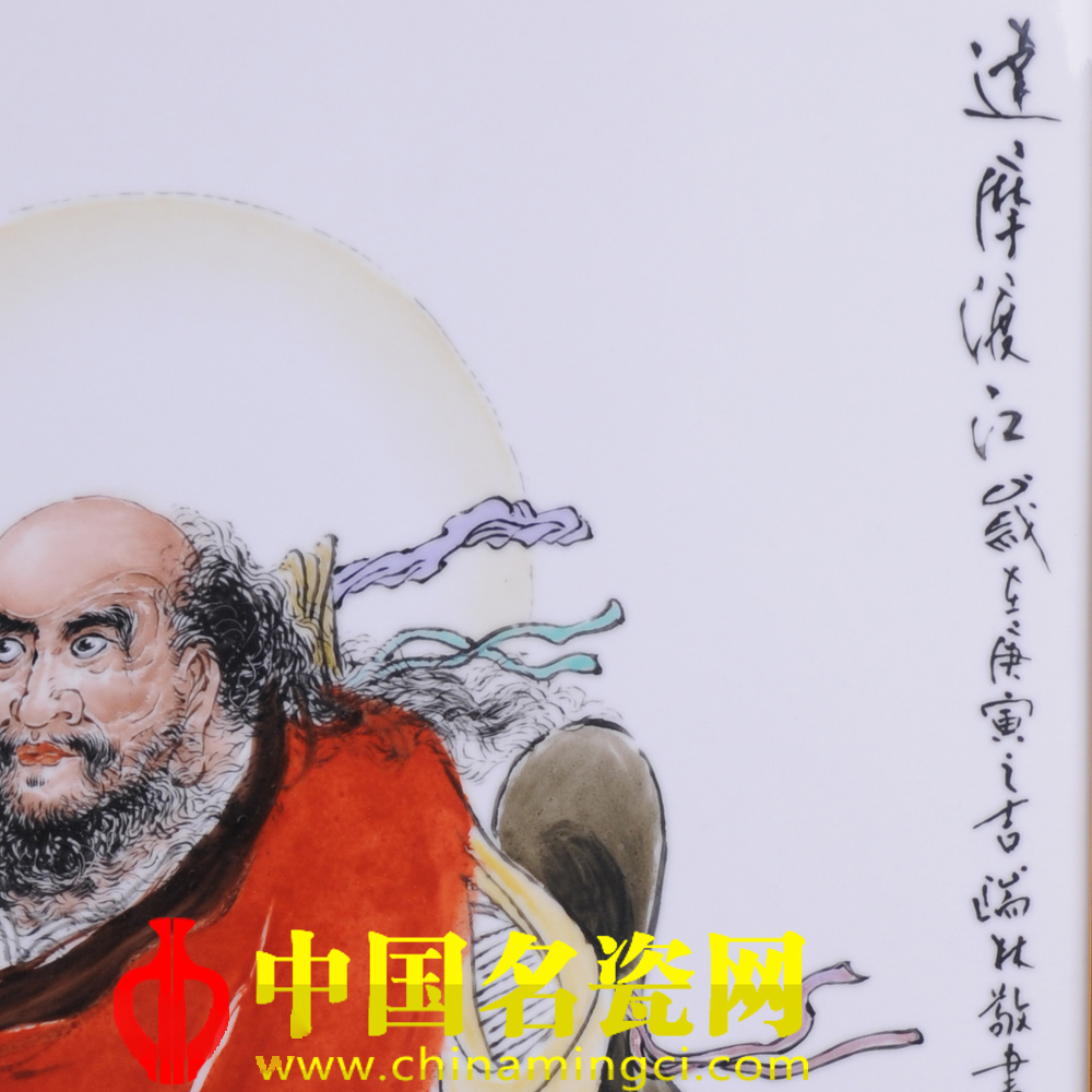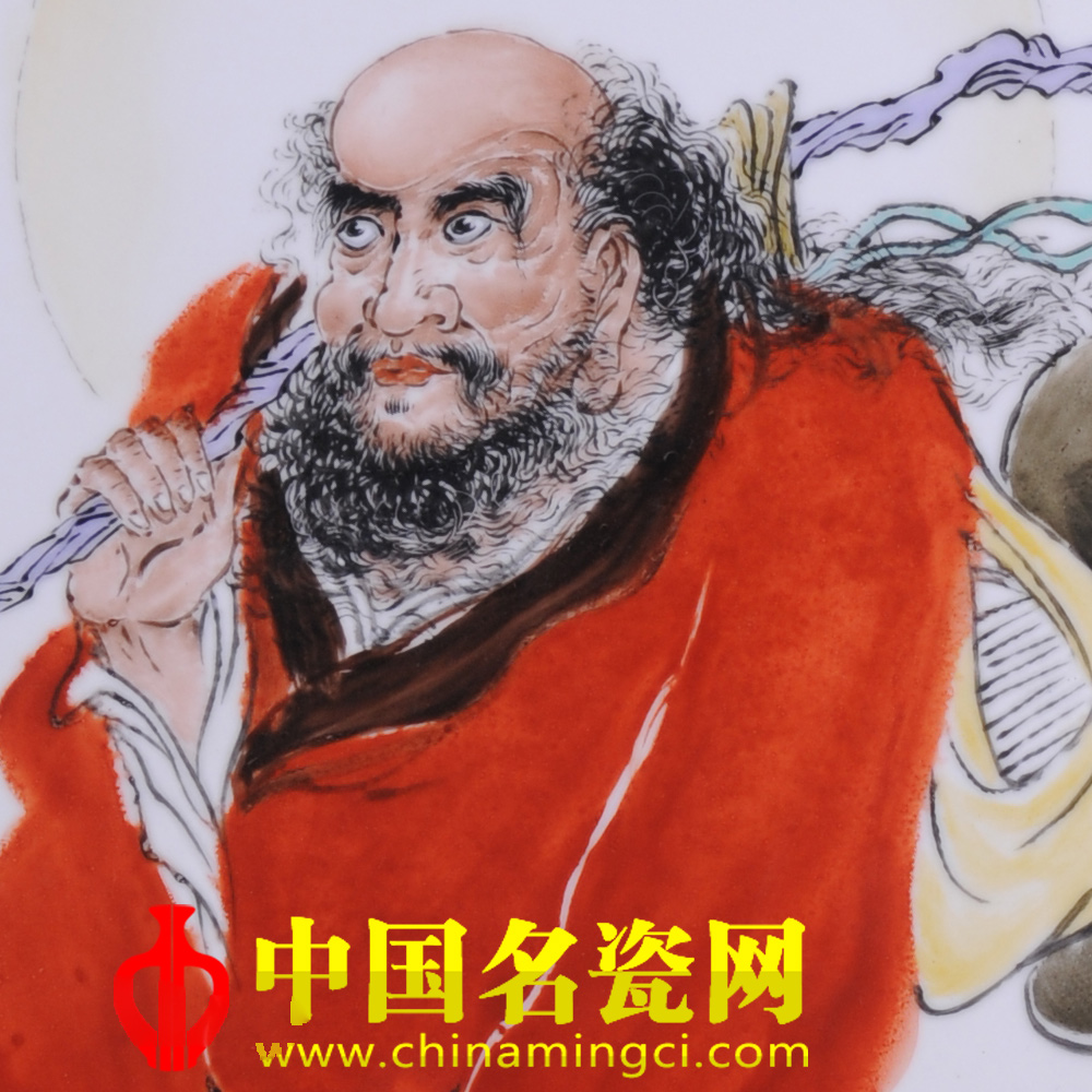 作品以传统仙、佛、历史人物为主。此图写达摩渡江,其身背斗笠,肩扛经包,将一双布鞋系于行囊底部,赤足轻踏一根芦苇,目光睿智,神情自若。江面波涛滚滚、浪花飞溅,波澜壮阔、大气庞然。其线描转折流畅,衣褶深浅分明,设色明暗有序,彰显了其粉彩人物画的独特风韵。